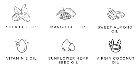 nourishing butters and oils like shea butter, mango butter, sunflower hemp seed oil, sweet almond oil and virgin coconut oil that work collectively to repair dull, dry and flaky skin texture.
