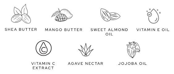 Agave Tequiliana (Agave Nectar), Organic Shea Butter (Butyrospermum Parkii), Mango (Mangifera Indica) Butter, Vitamin E extract, (Vitamin C) Orange Peel Powder, Prunus Amygdalus Dulcis (Sweet Almond) Oil, Hydrogenated Castor Oil, Simmondsia chinensis (jojoba oil), Carnauba Wax, Euphorbia Cerifera (Candelilla) Wax, Glyceryl Stearate, Flavor Oil